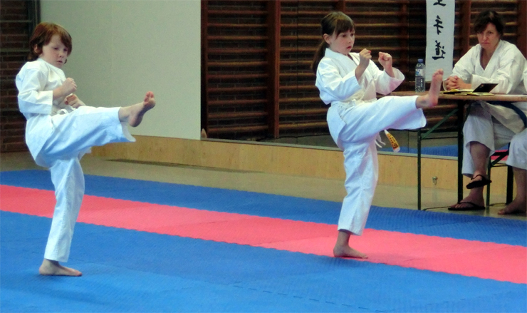 Vor dem wachsamen Auge von Abteilungsleiter und Prüfer Thomas Düfel und denen der Trainerinnen Andrea Schumann und Renate Wallis absolvierten die 9 Mädchen/Frauen und 7 Jungen/Männer ihr Programm, bestehend aus sogenannten Grundschultechniken (Grundstellungen, Angriffe und dazugehörige Blöcke), Kata (imaginärer Kampf gegen mehrere Gegner) und Zweikampf nach Vorgaben.